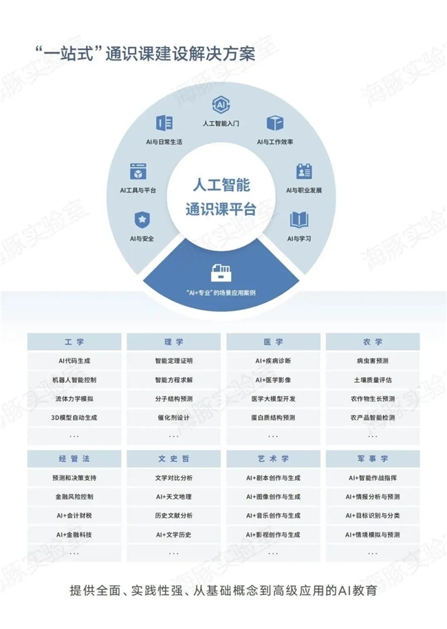 海豚實驗室立足高校多元學科背景,深度協同各學院,為學校量身打造高質量人工智能通識教育體系。針對不同專業學生特點,分別定制開發了不同的課程,并配套完整教學大綱與內容資源,全面支撐學校人工智能通識課程的系統化、差異化和高質量建設。
